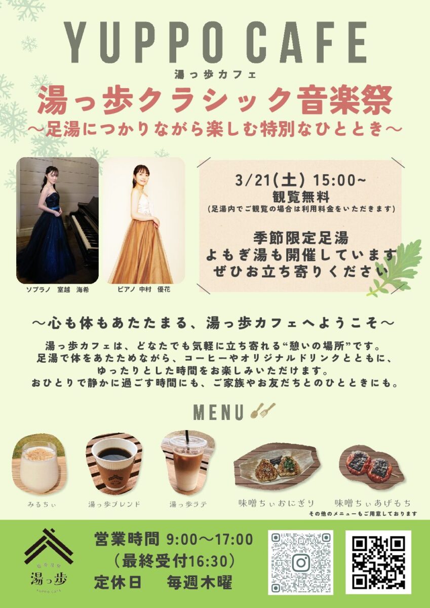 湯っ歩の里では、ソプラノとピアノによるミニコンサートを開催いたします。