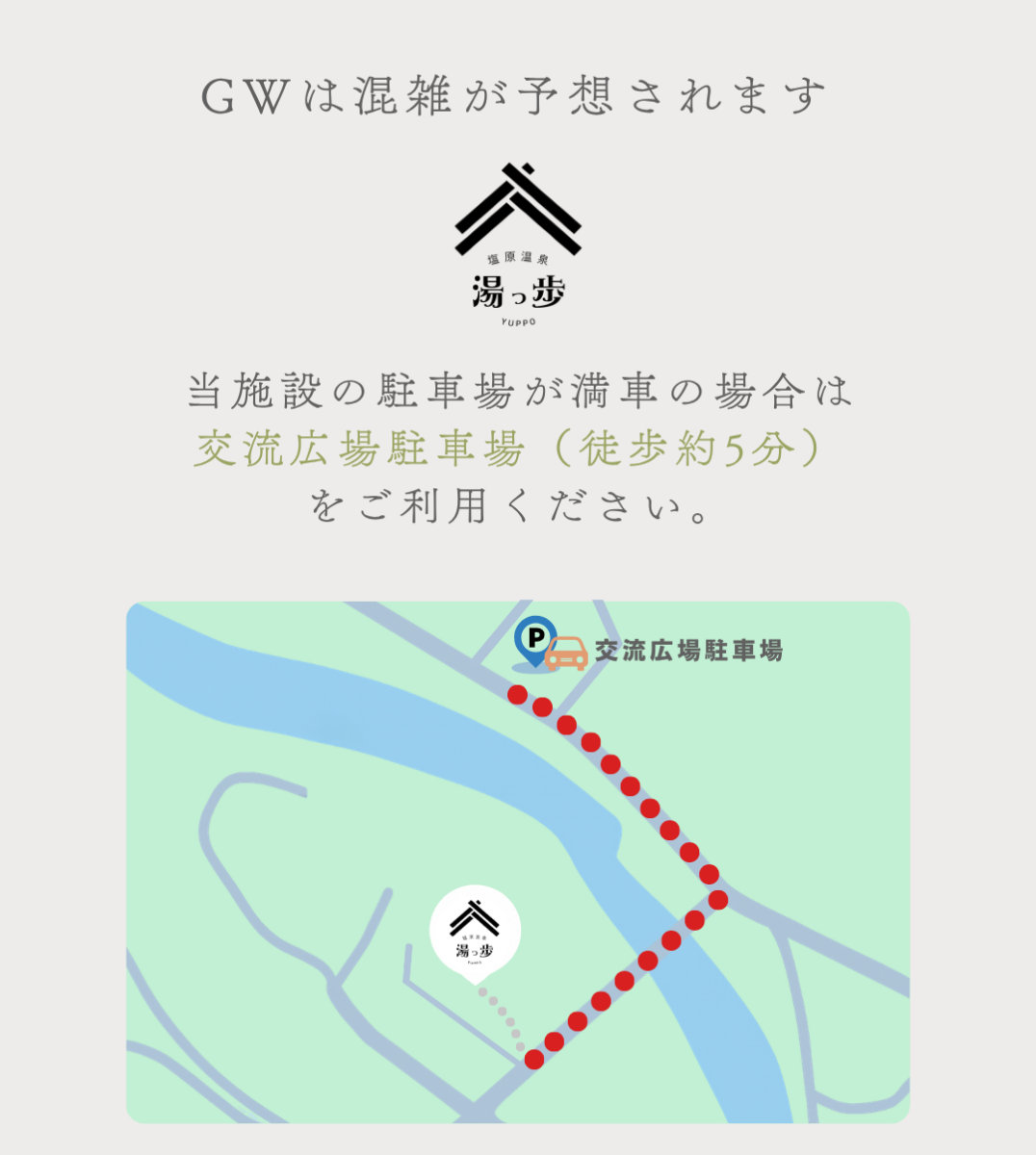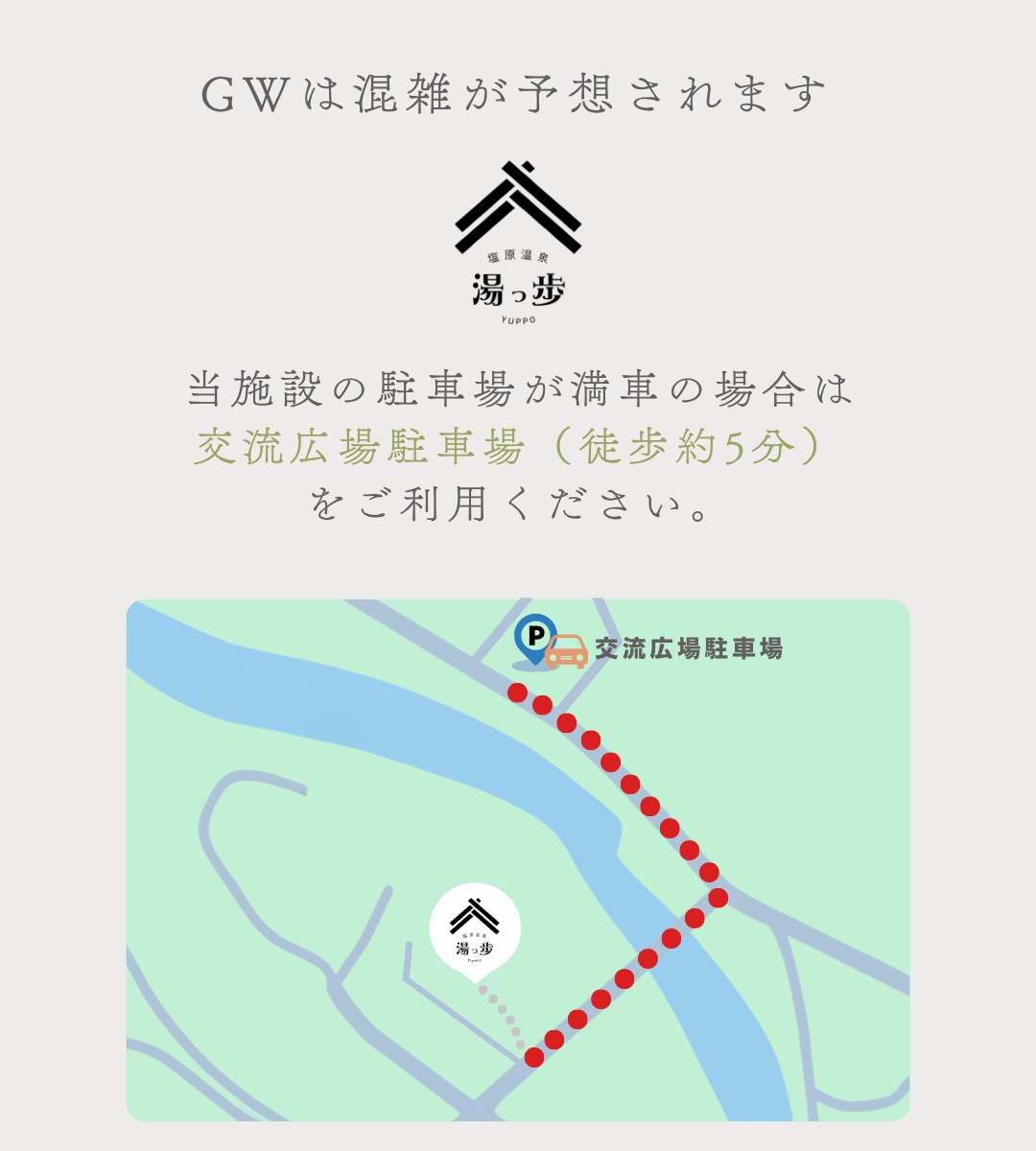ゴールデンウィーク期間中は、湯っ歩の里周辺の混雑が予想されます。 湯っ歩の里駐車場が満車の場合は、交流広場駐車場(徒歩約5分) をご利用ください。